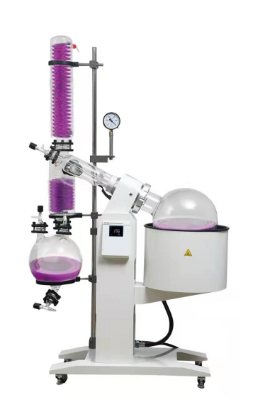 旋轉蒸發器是用無級調速使玻璃旋轉瓶恒速旋轉,物料在瓶壁形成大面積均勻薄膜,再由智能恒溫水浴鍋對旋轉瓶進行均勻加熱,在真空條件下高速蒸發,溶媒蒸氣經高效玻璃冷凝器冷卻,回收于收集瓶。