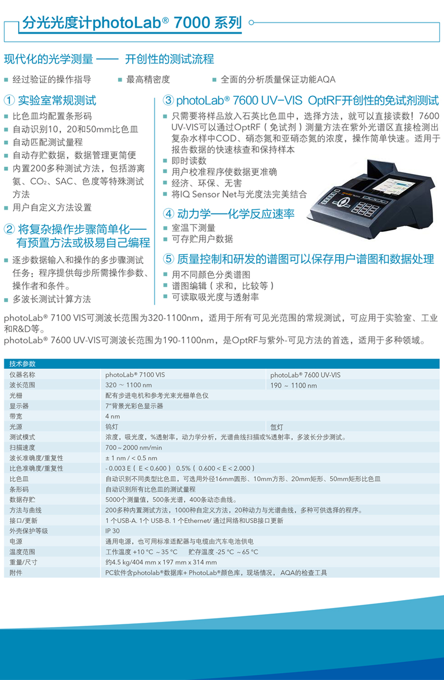 photoLab® 7100 VIS和photoLab® 7600 UV-VIS 集成了常規濃度分析、光譜分析和OptRF(optical reagent free measurement)測量功能。