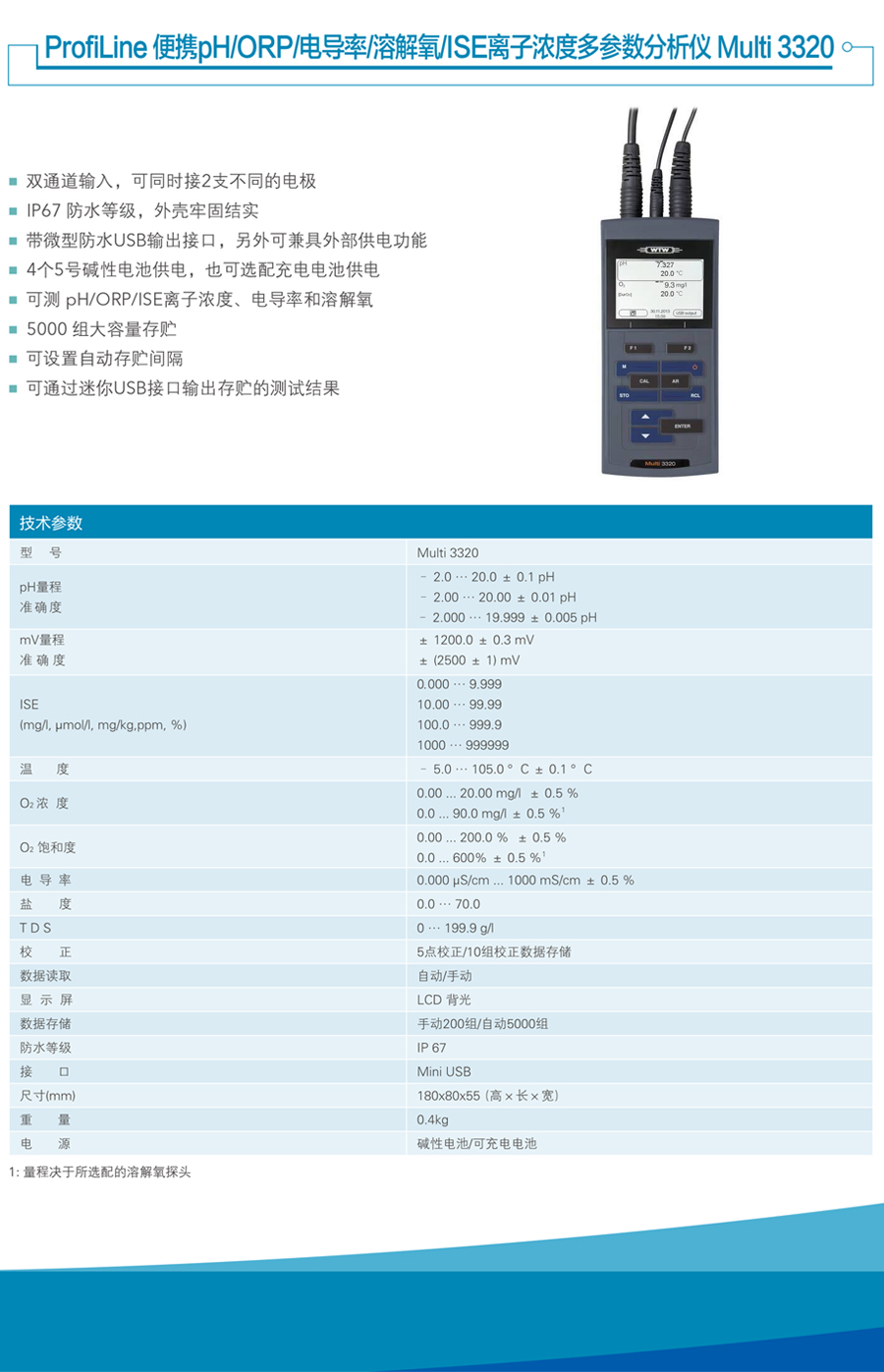 Multi 3320手持式多參數(shù)測試儀,測量PH、ORP、ISE、電導(dǎo)率、溶解氧及溫度,可連接各種模擬的標(biāo)準(zhǔn)PH復(fù)合電極或ORP電極、電導(dǎo)率電極、離子電極和溶解氧電極,LCD背光顯示,可同時檢測PH值、ORP值、電導(dǎo)率值、溶解氧值、溫度值等多種參數(shù)。