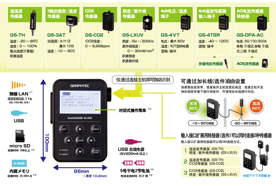 溫濕度傳感器(GS-TH)溫度·濕度·露點溫度·積算溫度的收錄、采樣1分鐘 / 文件大小為1個文件最大1.9GB(連接電源時)