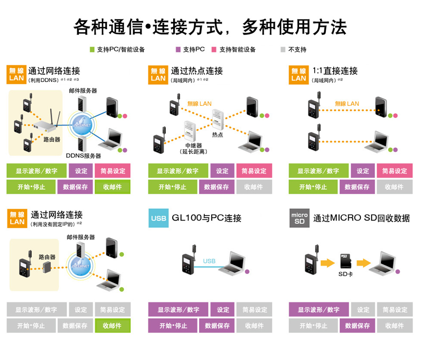 日本圖技GL100多功能便攜式數據記錄儀通訊功能: GL100-N標準型數據采集器可以通過USB接口和電腦通訊,通過電腦來讀取日本圖技GL100多功能便攜式數據記錄儀的數據,同時還可以控制GL100-N開始或者停止記錄,更改測試條件等。GL100-N免費提供專用分析軟件。日本圖技GL100多功能便攜式數據記錄儀無線版可以通過WIFI信號和電腦或者GL240/GL840實現無線通訊,電腦或者GL240/GL840記錄儀可以遠程讀取日本圖技GL100-wl中的數據。通過電腦還可以遠程對日本圖技GL100-wl進行操作。