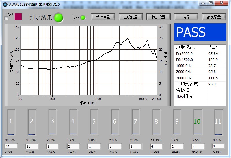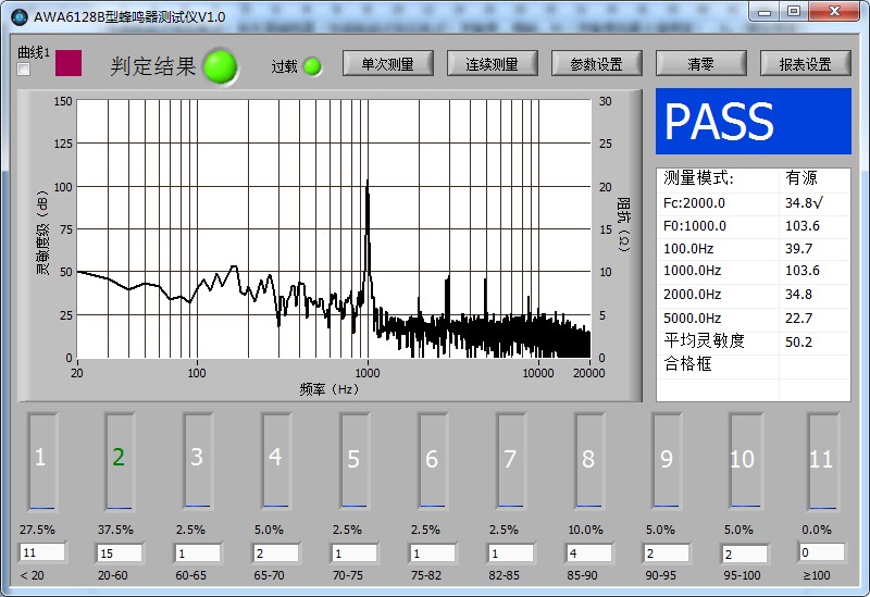 蜂鳴器測試儀是專用于蜂鳴器電聲特性測試的儀器。測試儀可以測試包括有源(包括電磁式和壓電式)和無源(包括電磁式和壓電式)兩種類型的蜂鳴器電聲指標。有源蜂鳴器通過輸入蜂鳴器的直流電壓,并選擇輸出方式,在主界面上會顯示在一段頻率范圍內的頻譜曲線,同時在右邊的結果顯示框中顯示最高點的頻率及靈敏度級,蜂鳴器出廠的額定頻率及對應的靈敏度級(頻率可以在參數設置界面自行輸入)。無源蜂鳴器通過輸入信號幅度,并可以自定義輸出的頻率范圍,在所定義的頻率范圍內輸出頻響曲線。同時可以顯示平均靈敏度,諧波失真,阻抗及曲線最高點的頻率及相對應的靈敏度級,同時還可以顯示出廠額定頻率及對應的靈敏度級。測試結束后,根據自定義的標準,簡潔直觀的顯示 PASS/FAIL,自動判斷是否合格。可以和自動分選機臺配合使用,自動判斷是否合格,進行產品分檔,極大的提高了測試效率。