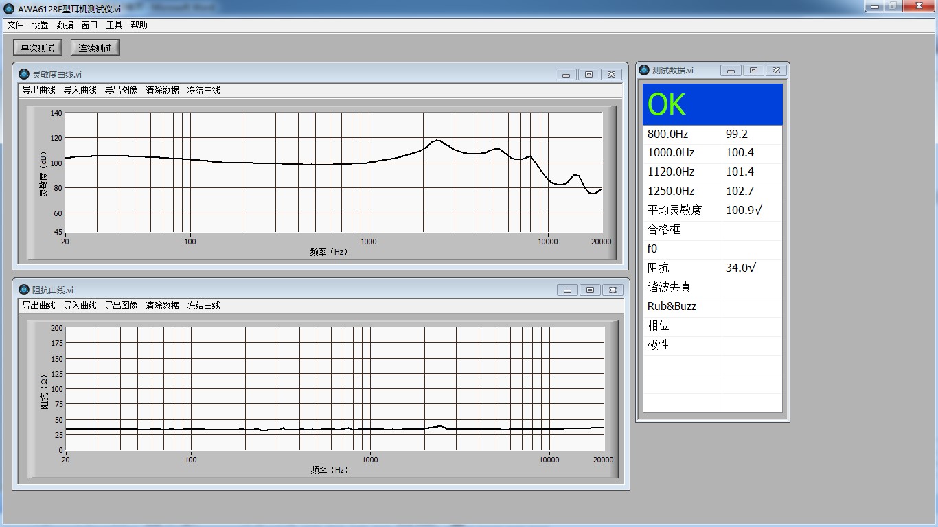 儀器可以同時測量耳機頻響、阻抗、諧波失真、異音、極性、相位和特性電壓等參數(shù)。根據(jù)設(shè)定的門限判斷耳機合格品或不合格品。測試結(jié)束后,簡潔直觀的顯示出PASS/FAIL,極大的提高了測試效率。