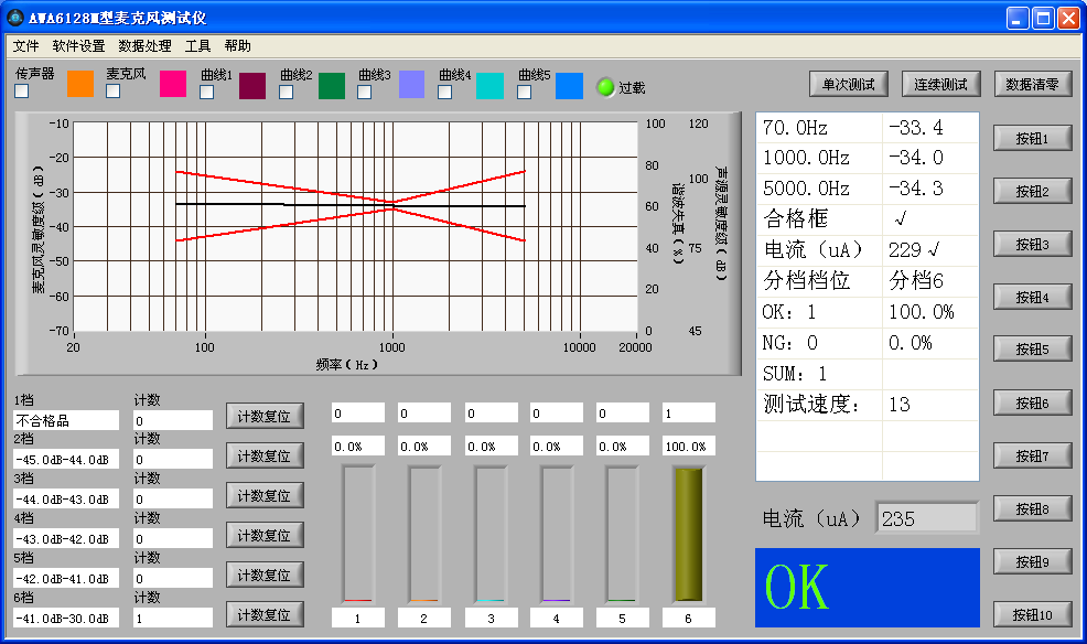 AWA6128M型駐極體傳聲器測試儀主要由測試主機、帶聲反饋測試傳聲器的測試聲源和控制盒等組成,主要配合分選臺對駐極體傳聲器(咪頭)進行自動分類。測試儀同時測量駐極體傳聲器的低頻靈敏度、1 kHz靈敏度、高頻靈敏度和工作電流等參數。高頻和低頻測試頻率可自行設定,也可選擇不測。根據駐極體傳聲器的中頻靈敏度、低頻上下限、高頻上下限、漏氣、電流等測量結果對駐極體傳聲器進行分類,通過串口輸出分檔指令給分選臺,并統計分類結果。簡潔直觀地顯示 PASS/NG測量結果,自動判斷良品和不良品,極大的提高了測試效率。聲反饋測試傳聲器同時測量聲源的聲壓,反饋控制信號源的輸出,使聲源聲壓保持恒定,從而排除由于測試聲源聲信號的不穩定而造成的測試結果前后變化。