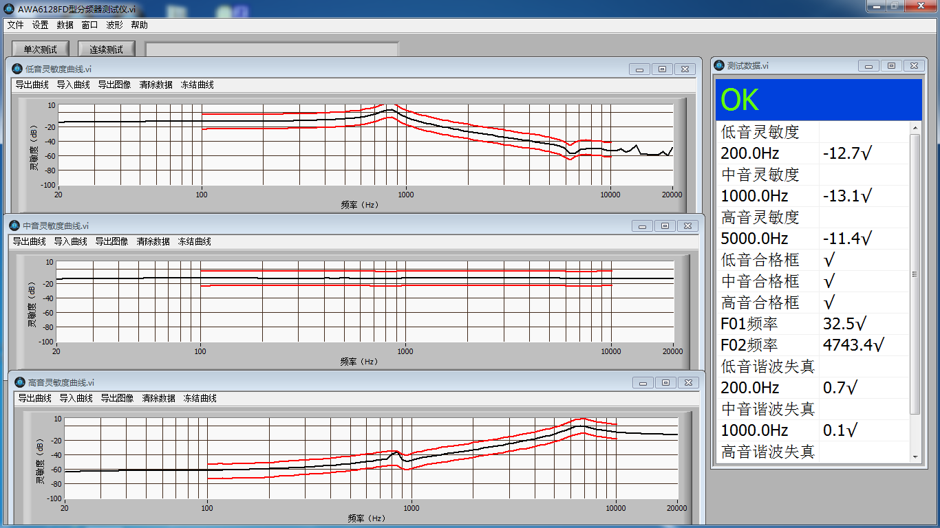 AWA6128FD型分頻器測(cè)試儀可以同時(shí)測(cè)量三分頻的高通(高頻)、帶通(中頻)、低通(低頻)的靈敏度曲線。也可以同時(shí)測(cè)量二分頻的高通、低通的靈敏度曲線。每個(gè)通道靈敏度曲線均可以單獨(dú)設(shè)置合格框,軟件根據(jù)每個(gè)通道的靈敏度曲線合格框給出判定結(jié)果。儀器特點(diǎn):全中文的Windows 界面,操作性更強(qiáng),充分降低初期成本的投入和維護(hù)費(fèi)用,具有高效、強(qiáng)大的分析和處理能力。能快速地完成耳機(jī)揚(yáng)聲器等電聲產(chǎn)品的測(cè)試,是基于生產(chǎn)線和質(zhì)量控制(QC)、操