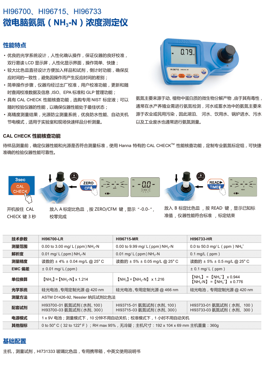 主機,HI93733-01 專用氨氮HR試劑,HI731333 定制專用玻璃比色皿(2個),HI731318 專用玻璃比色皿清潔布(2塊),中英文使用說明書,HI721006 定制專用儀器攜帶箱【溫馨提示:為了核查儀器性能,請訂購HI96733-11氨氮NIST測量曲線標定組,為了確保測量精度及讀數穩定性,建議選購HI83300-100待測水樣前處理器,消除待測水樣懸浮物或顏色的干擾】