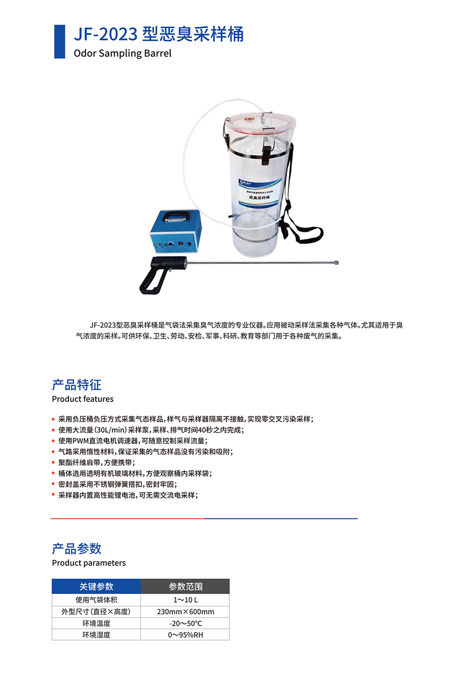 產品描述:JF-2023型惡臭采樣桶是氣袋法采集臭氣濃度的專業儀器。應用被動采樣法采集各種氣體。尤其適用于臭氣濃度的采樣。可供環保、衛生、勞動、安檢、軍事、科研、教育等部門用于各種廢氣的采集。